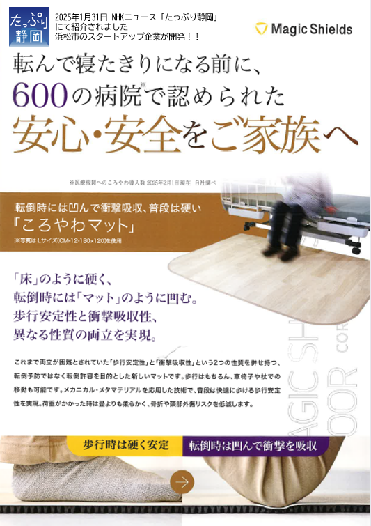 村松商店は、「静岡県を元気に!!」をスローガンに、主に県内で起業したスタートアップ企業への応援活動を積極的に行っています。2025年に入り、浜松市から起業された株式会社マジックシールズ様が開発した「ころやわマット」の取扱・販売を始めました。